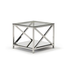 This elegant table is crafted from polished stainless steel, clear toughened glass and a beautiful mirror base.