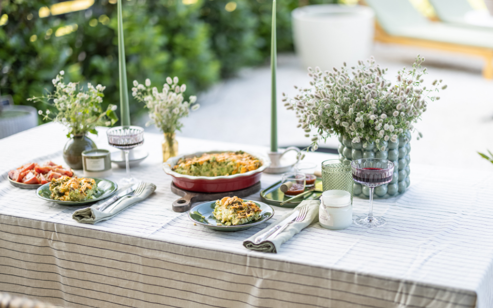 Throw a lovely table cloth on with a vase or pot of garden flowers for a relaxed summery feel and add outdoor cushions to a bench seat to accommodate extra visitors.