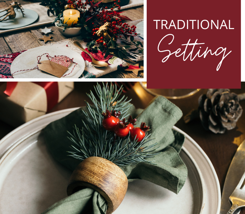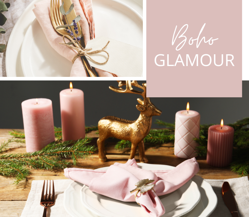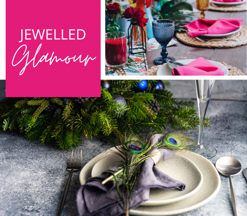 The success of a decorative display is all in the detail. Tie napkins in festive ribbon or get bespoke ring holders to keep them neat and looking smart. Glass wear can really elevate the look, look for gold rimmed or cut crystal style which will catch the light and make your display shine. Spoil your guests with a gorgeous festive display and create a day to remember.