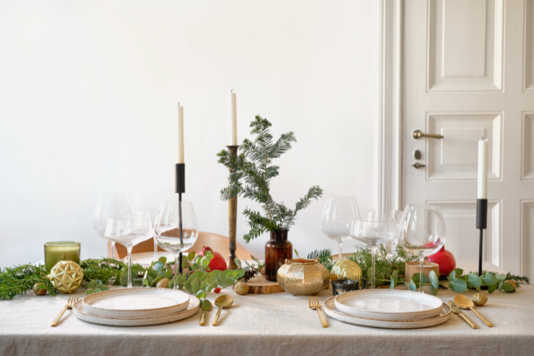 Defining your theme can seem limiting but it can actually help create a stunning, cohesive scheme for your home. You can pick an area which is the focal point where all the colours and textures come together and then take accents of those around the house, this could be on shelving, window ledges, bannisters and fireplaces. An obvious focal point is your Christmas tree, the centre point to your room and therefor your colour scheme, however your dining table can be a lovely way to unite your decor and space whilst creating a stunning setting for your guests on Christmas Day.