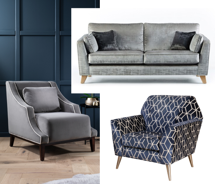Art Deco-inspired sofas and chairs often have broad arms, sweeping curved backs and