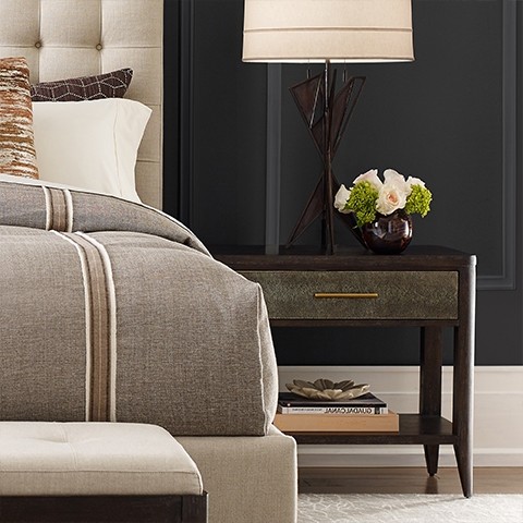 Be mindful of complimentary finishes in metal or wood to unite the overall effect and make sure the size allows for a lamp to sit on top with ample room still for a glass of water or book.![]()