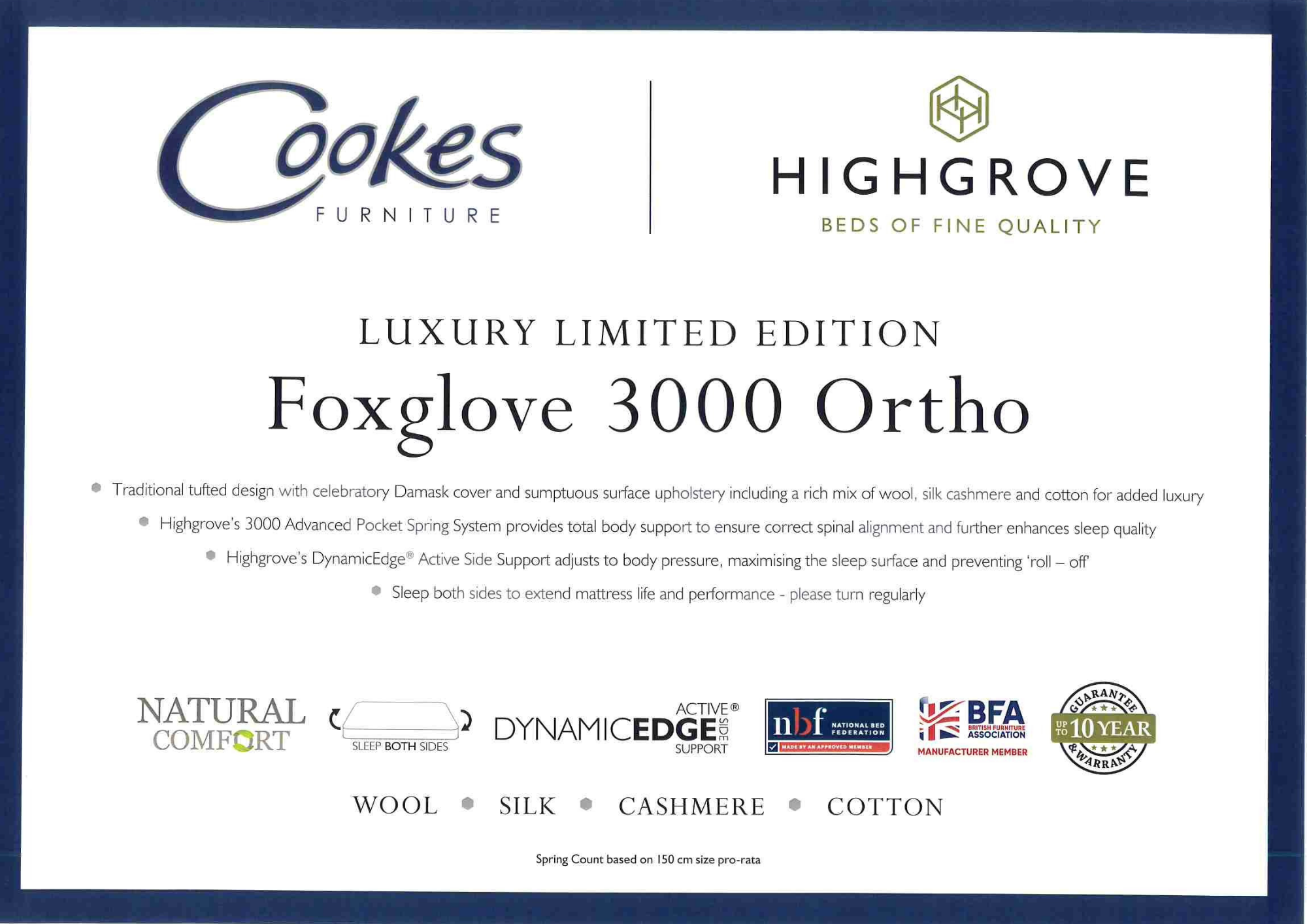 Perfect for those seeking firm support, premium craftsmanship, and long-term durability, the Foxglove 3000 Ortho delivers a truly supportive and restorative night’s sleep.