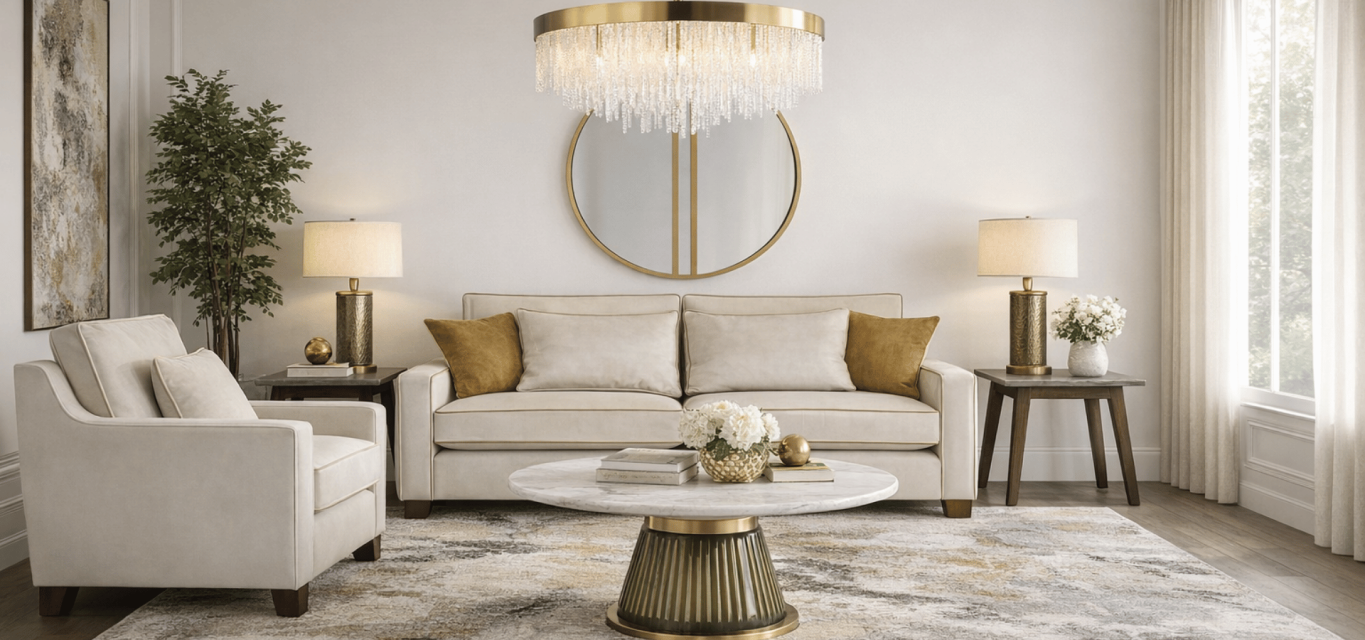 Modern Luxe Living brings together soft neutral tones, warm metallic accents, and refined textures to create a space that feels both sophisticated and welcoming. Plush seating, elegant lighting, and statement pieces work together to deliver a look that is timeless yet effortlessly modern. Designed for both comfort and style, this collection helps transform your living room into a beautifully balanced space for relaxing, entertaining, and everyday living.